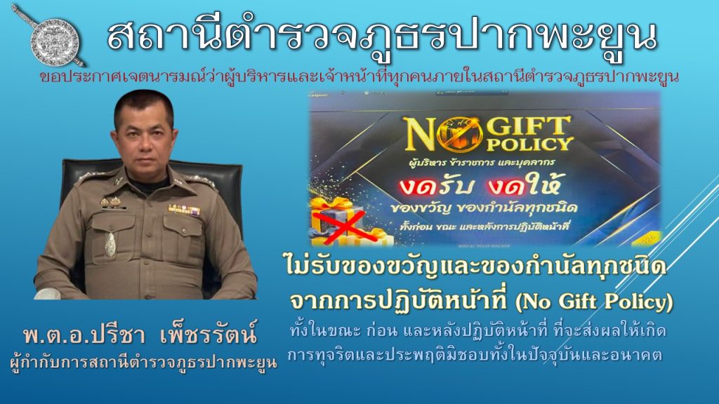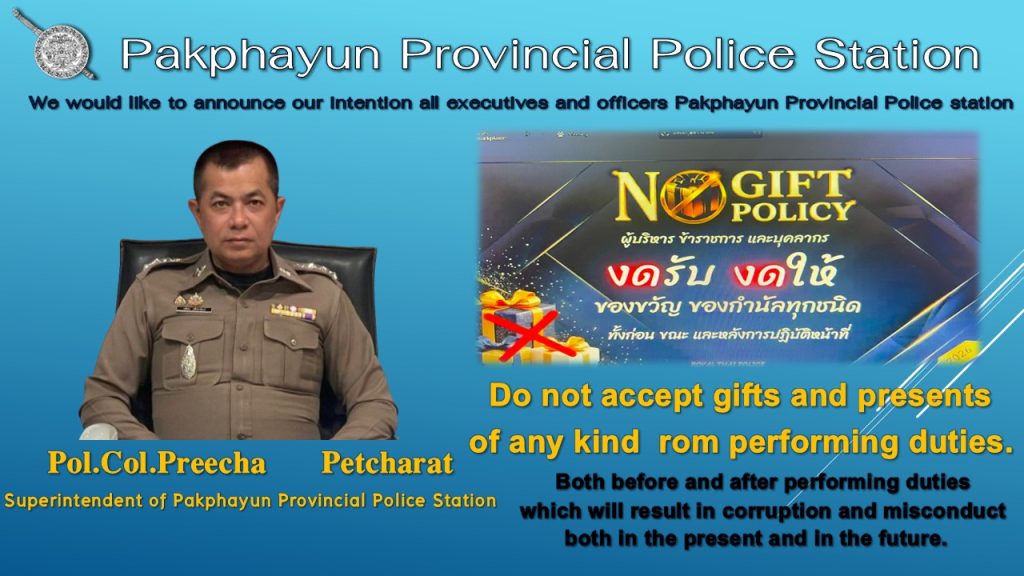 พ.ต.อ.ทวีศักดิ์ ขำผุด ผกก.สภ.ปากพะยูน พร้อมข้าราชการตำรวจในสังกัด ประกาศเจตนารมณ์ ที่จะไม่รับของขวัญและของกำนัลหรือประโยชน์อื่นใด ( No Gift Policy) ทุกชนิดจากการปฏิบัติหน้าที่